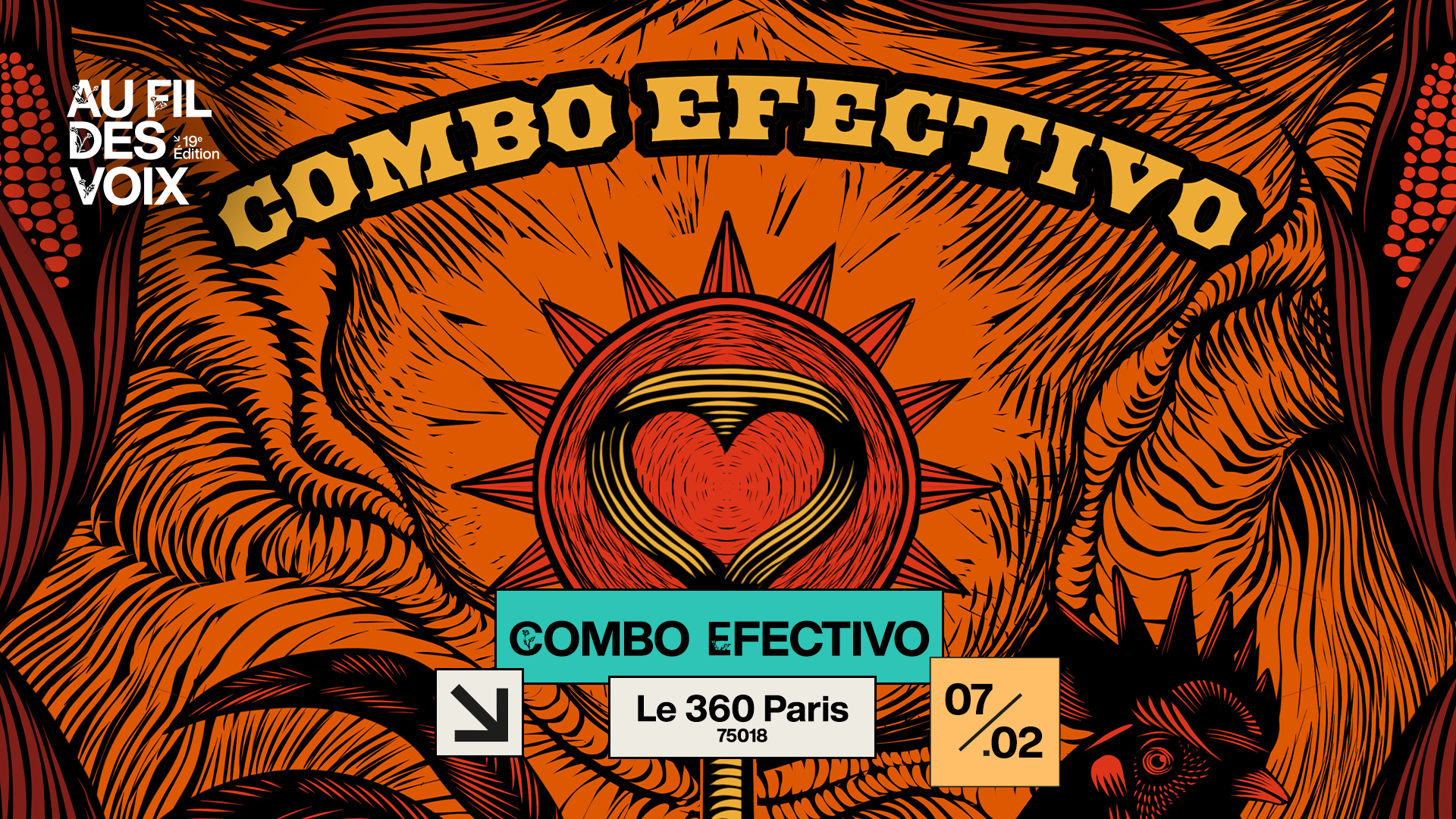 Pour fêter la sortie de son tout premier disque, Au Fil des Voix s’associe à Casa Maguey Records, nouveau label franco-colombien, pour une soirée placée sous le signe du feu vibrant de la création transculturelle. Au cœur de cette aventure, Combo Efectivo, fruit du laboratoire créatif transatlantique Jazztropicante, réunit des musiciens bourrés de talents, français (Léon Phal, Antoine Berjeaut, Stéphane Montigny) et colombiens (Kike Narváez, Pelango, Ruben Aragón, Karen Nerak), pour une création inédite : un dialogue vibrant entre jazz libre et rythmes tropicaux, improvisation et transe collective. Une traversée sonore où les frontières s’effacent dans la joie du groove partagé.
